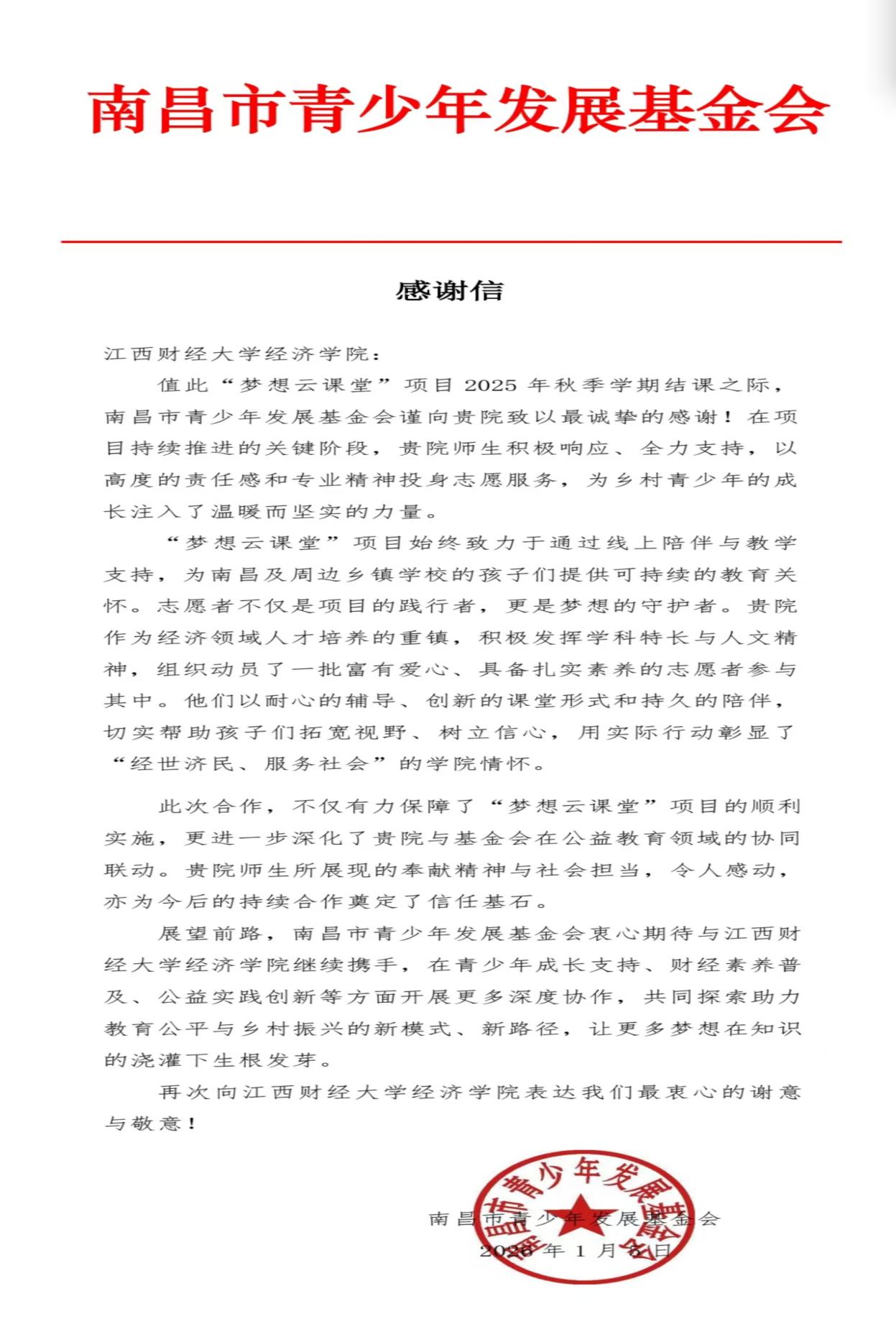 当专业知识的星火,遇见乡村少年的憧憬,一场关于成长的双向奔赴,在2025年的“梦想云课堂”里悄然绽放。2026年1月5日,抖陰破解版 收到南昌市青少年发展基金会发来的感谢信,字里行间的肯定,是这个冬日里最温暖的回响。
