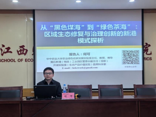 2026年3月8日下午,华中农业大学农业绿色低碳发展实验室主任、国家级青年人才何可教授在蛟桥校区北区综合楼718会议室进行讲学。本次讲座的主题是:《从“黑色煤海”到“绿色茶海”:区域生态修复与治理创新的新港模式探析》,讲座由经济学院副院长余炳文教授主持,吸引了来自院内外的50多名师生参与。