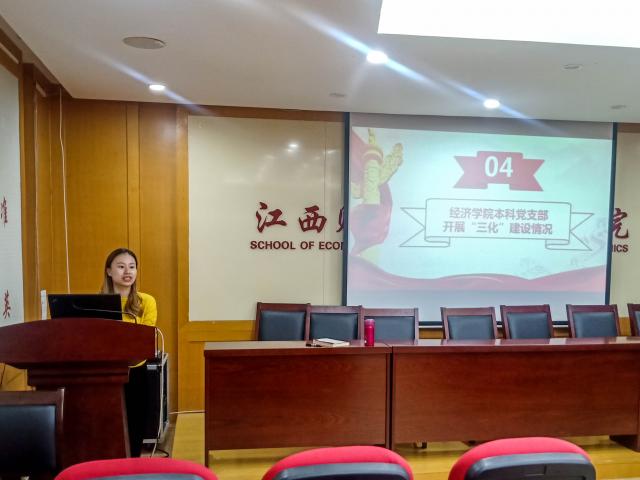 接着,在展示经济学院本科党支部开展“三化”建设情况过程中,万婧怡同志向学生党员们强调了学生党员作为学生中的先进分子,应在树立大学生形象,引导广大学生树立正确的人生观价值观方面起到积极作用。各位学生党员应当以身作则,发挥党员先锋模范作用。