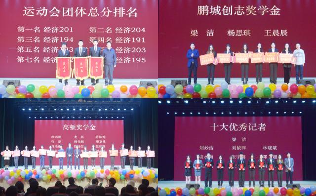为表彰在各方面具有突出表现的同学,激励全体学生努力学习,晚会期间颁发了“鹏城创志奖学金”、“高顿奖学金”、“运动会团体总分前三”和“十大优秀记者”等奖项。(作者/刘妙洁 作者单位/经济学院 图/周亦君、张宇璐 图片作者单位/经济学院)